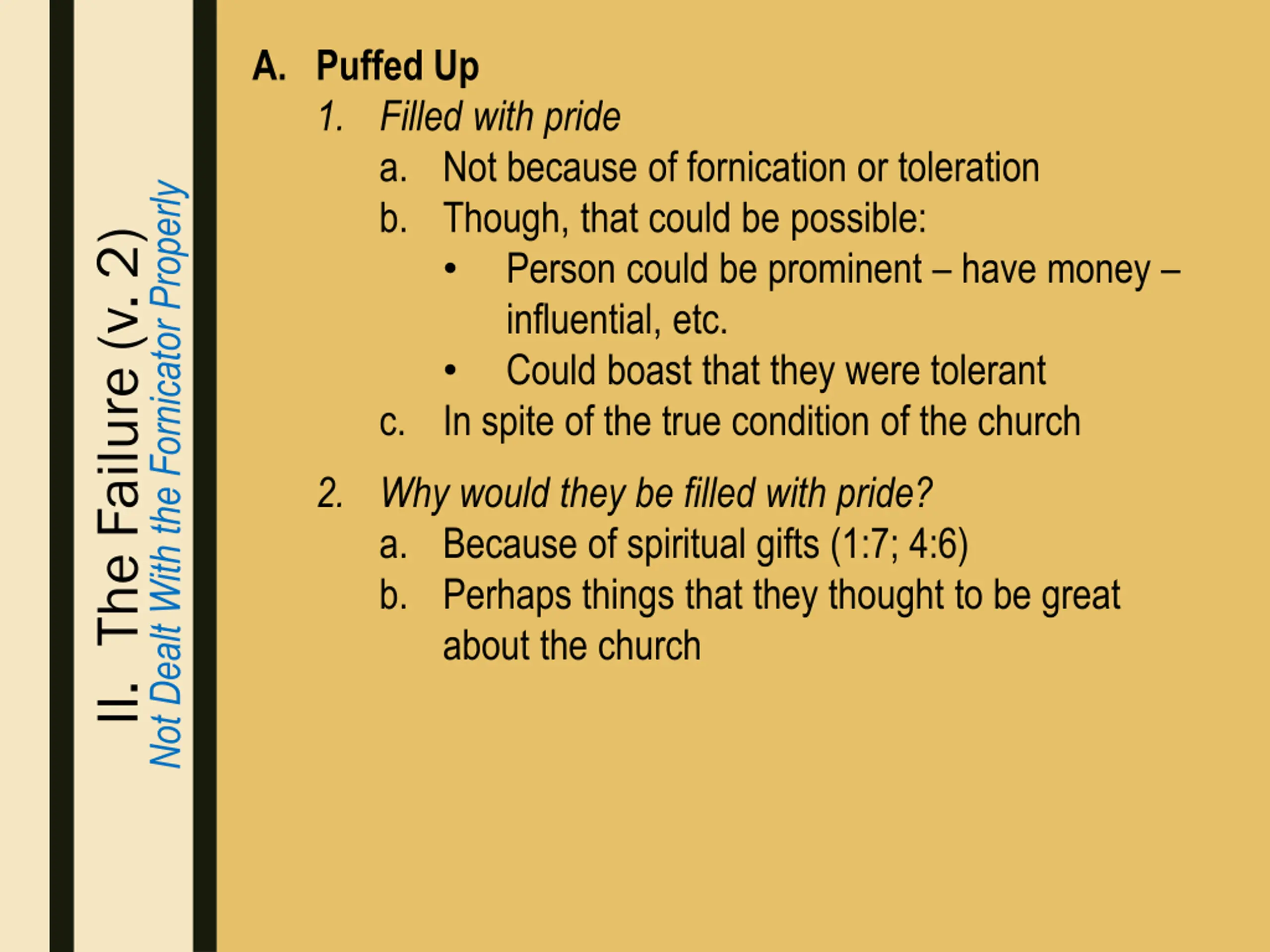 A. Puffed Up 1. Filled with pride a. Not because of fornication or toleration b. Though, that could be possible: • Person could be prominent – have money – influential, etc. • Could boast that they were tolerant c. In spite of the true condition of the church Not Dealt With the Fornicator Properly II. The Failure (v. 2) 2. Why would they be filled with pride? a. Because of spiritual gifts (1:7; 4:6) b. Perhaps things that they thought to be great about the church