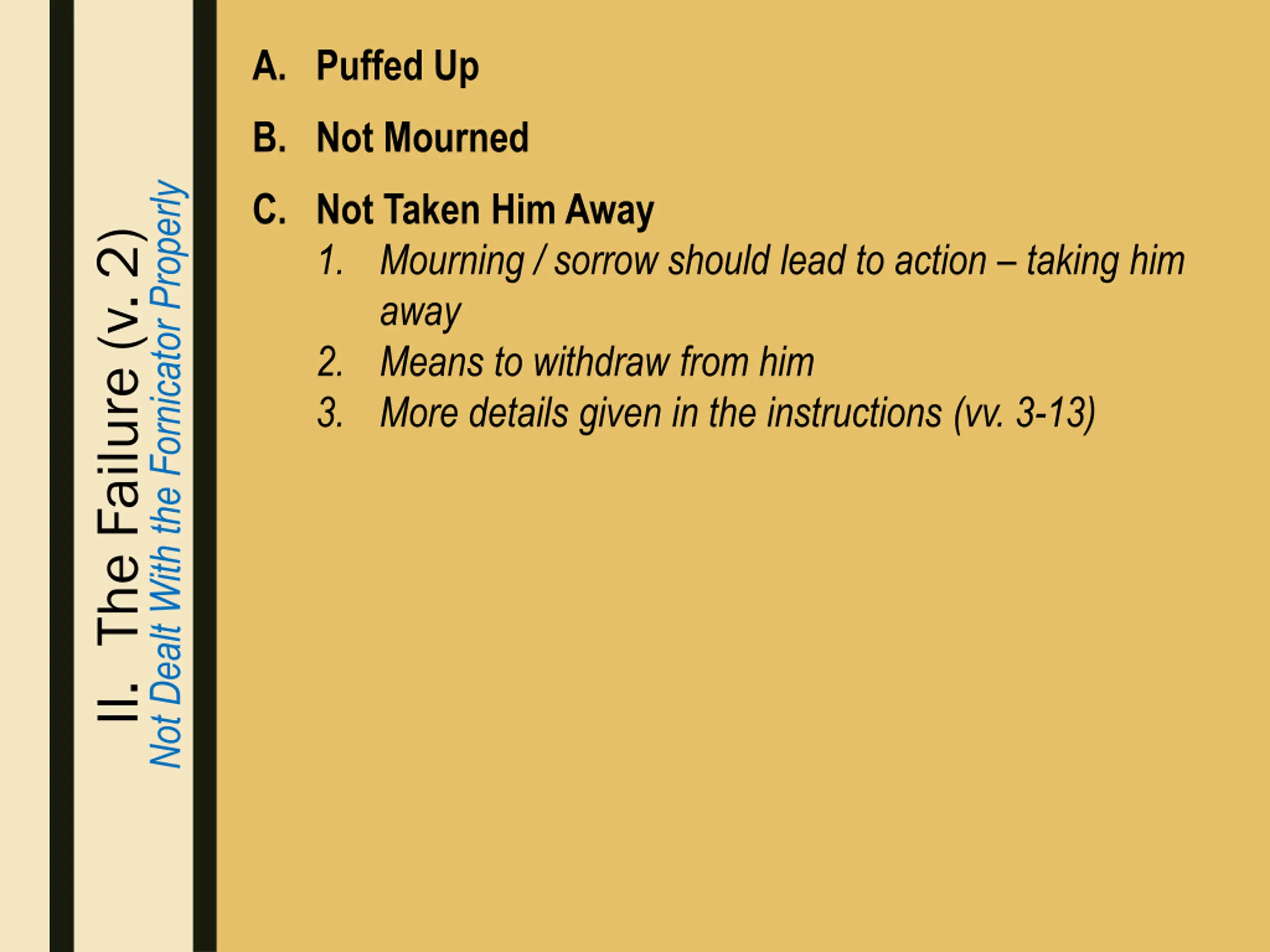 A. Puffed Up B. Not Mourned Not Dealt With the Fornicator Properly C. Not Taken Him Away 1. Mourning / sorrow should lead to action – taking him away 2. Means to withdraw from him 3. More details given in the instructions (vv. 3-13) II. The Failure (v. 2)