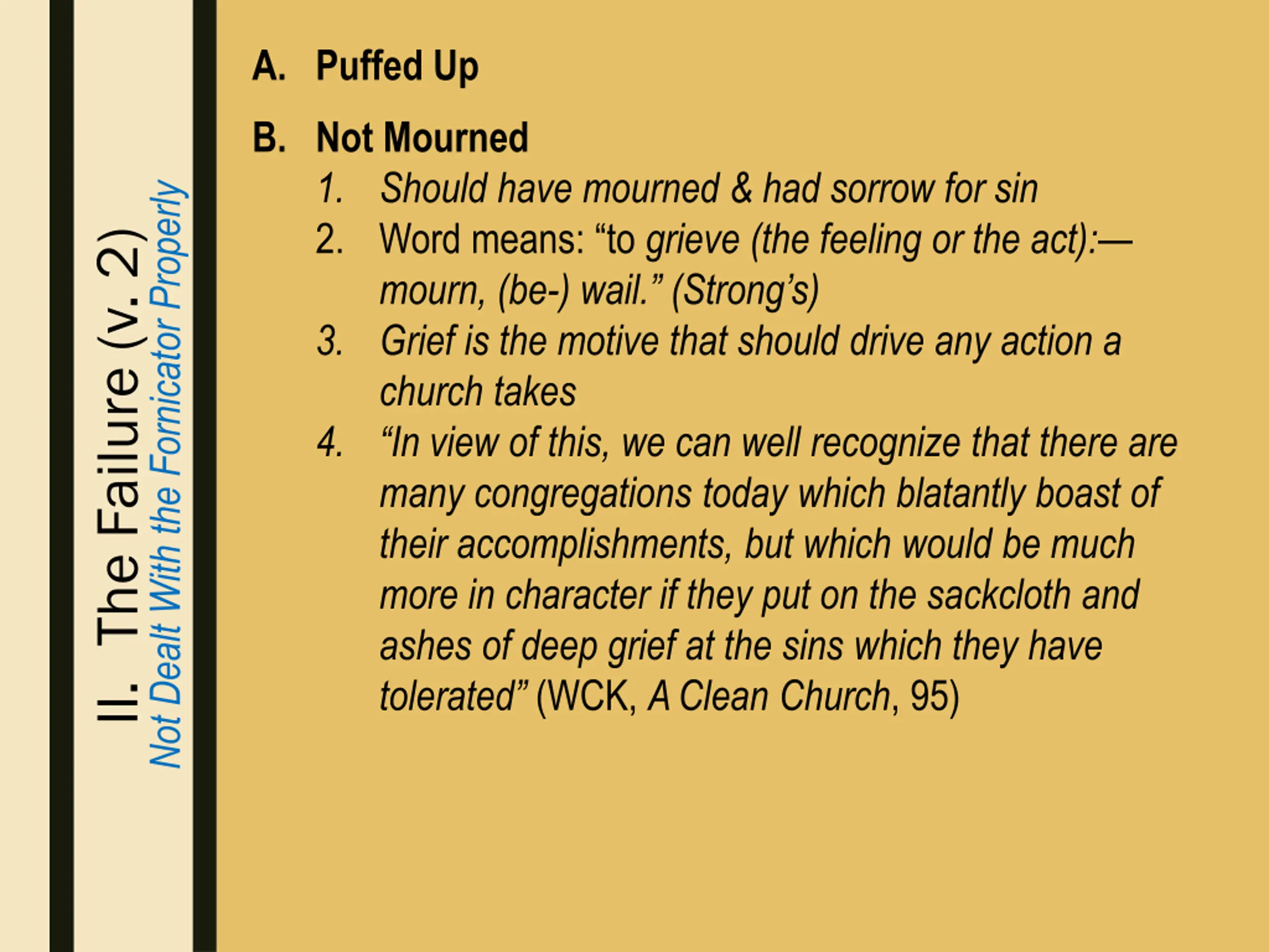 A. Puffed Up B. Not Mourned 1. Should have mourned & had sorrow for sin 2. Word means: “to grieve (the feeling or the act):— mourn, (be-) wail.” (Strong’s) 3. Grief is the motive that should drive any action a church takes 4. “In view of this, we can well recognize that there are many congregations today which blatantly boast of their accomplishments, but which would be much more in character if they put on the sackcloth and ashes of deep grief at the sins which they have tolerated” (WCK, A Clean Church, 95) Not Dealt With the Fornicator Properly II. The Failure (v. 2)