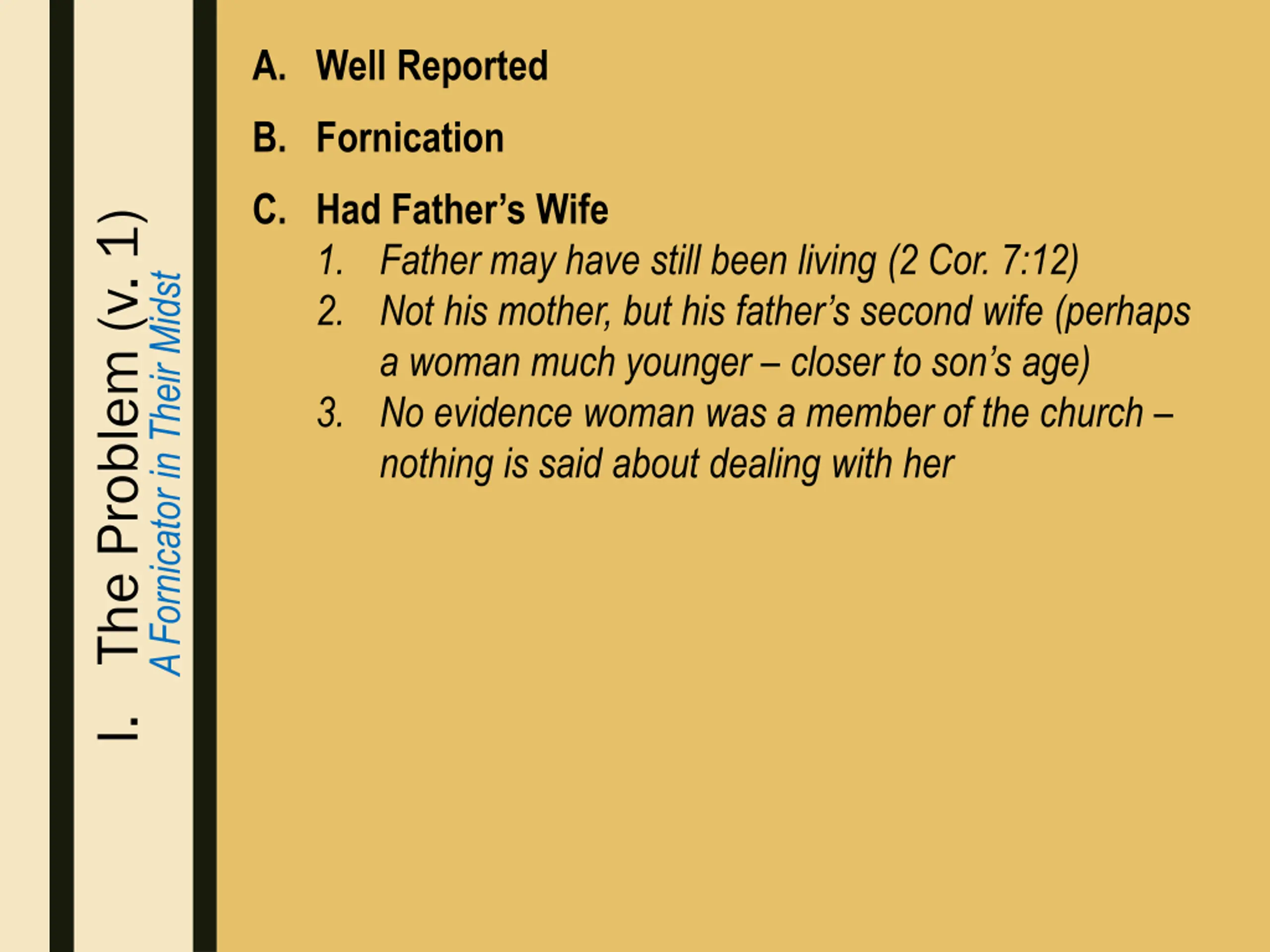 A. Well Reported B. Fornication C. Had Father’s Wife 1. Father may have still been living (2 Cor. 7:12) 2. Not his mother, but his father’s second wife (perhaps a woman much younger – closer to son’s age) 3. No evidence woman was a member of the church – nothing is said about dealing with her I. The Problem (v. 1) A Fornicator in Their Midst