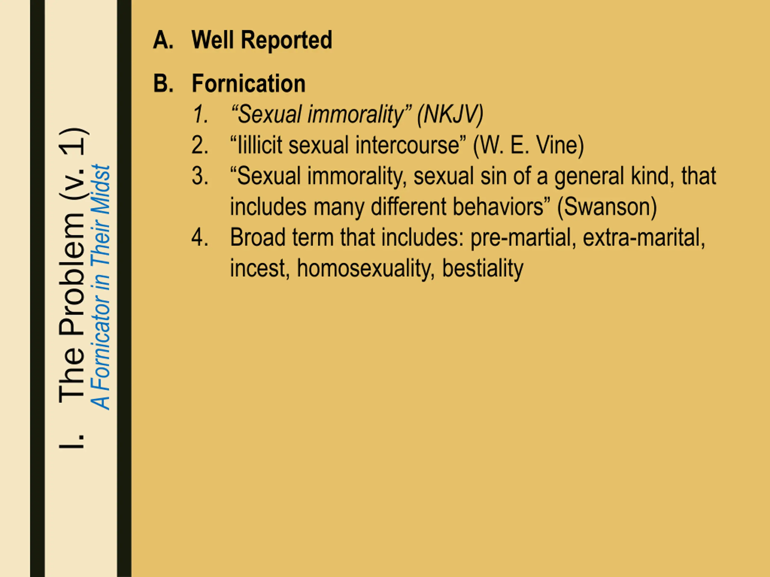 A. Well Reported B. Fornication 1. “Sexual immorality” (NKJV) 2. “Iillicit sexual intercourse” (W. E. Vine) 3. “Sexual immorality, sexual sin of a general kind, that includes many different behaviors” (Swanson) 4. Broad term that includes: pre-martial, extra-marital, incest, homosexuality, bestiality I. The Problem (v. 1) A Fornicator in Their Midst