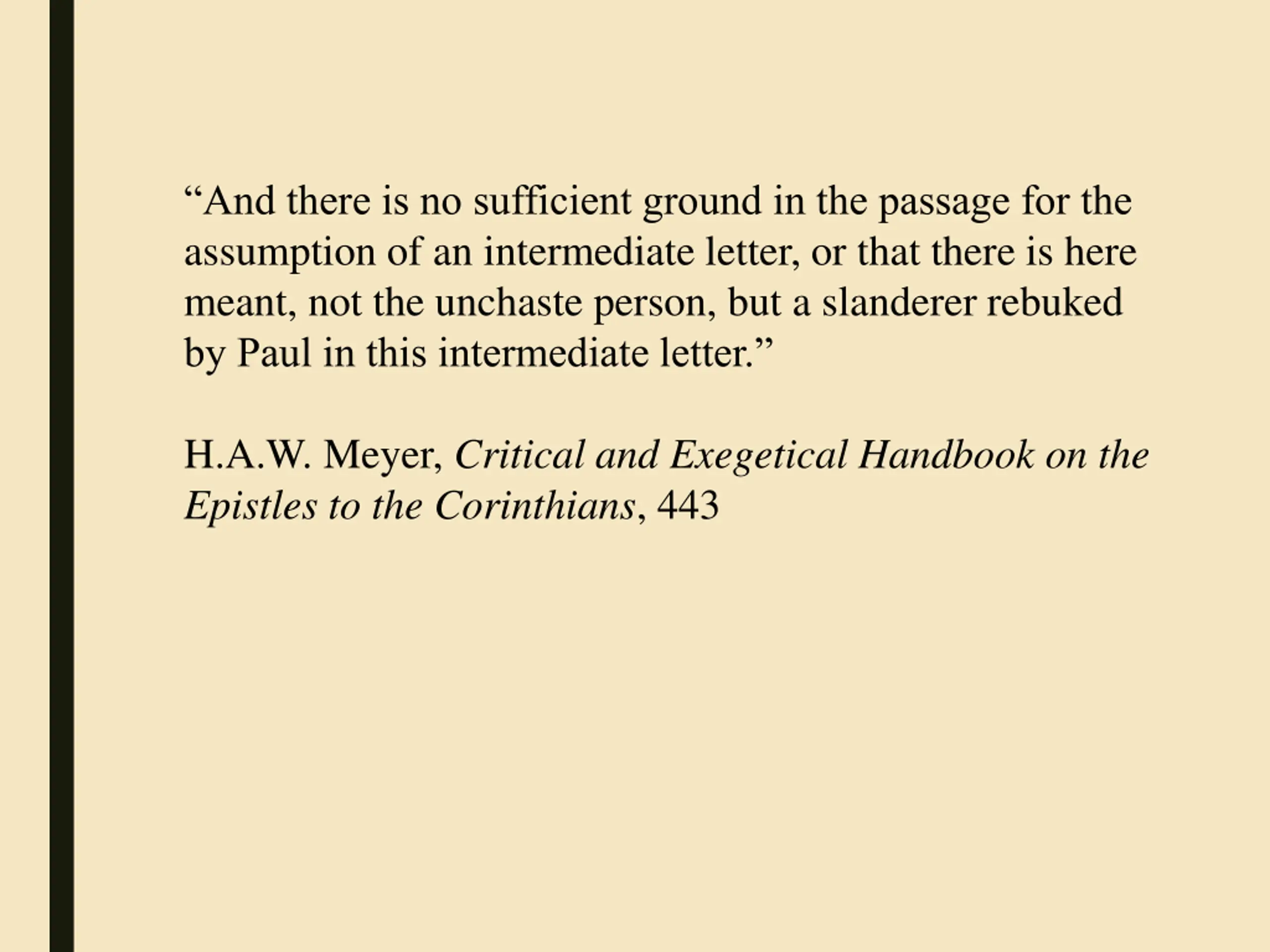 “And there is no sufficient ground in the passage for the assumption of an intermediate letter, or that there is here meant, not the unchaste person, but a slanderer rebuked by Paul in this intermediate letter.” H.A.W. Meyer, Critical and Exegetical Handbook on the Epistles to the Corinthians, 443