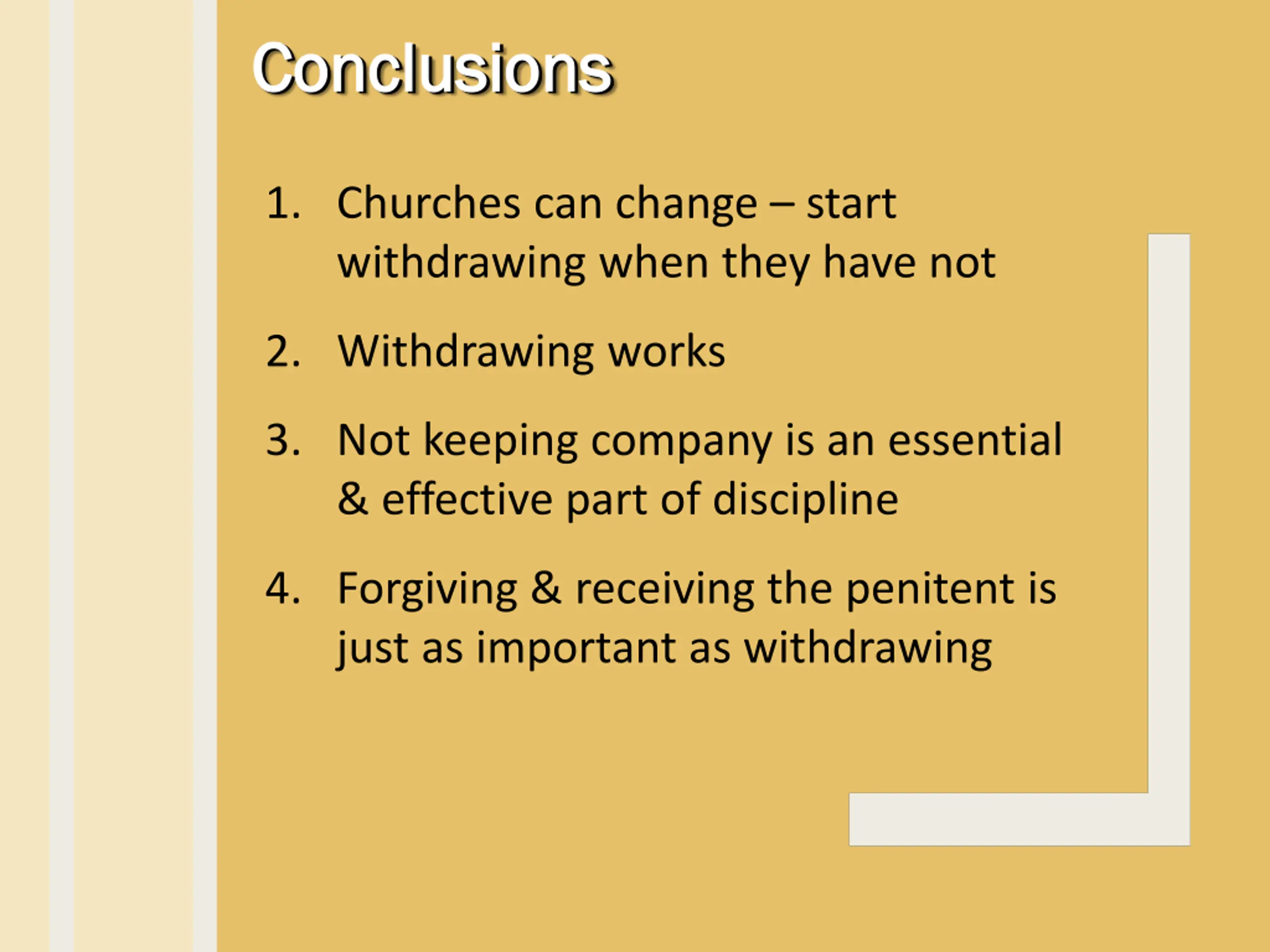 Conclusions Conclusions Conclusions Conclusions 1. Churches can change – start withdrawing when they have not 2. Withdrawing works 3. Not keeping company is an essential & effective part of discipline 4. Forgiving & receiving the penitent is just as important as withdrawing