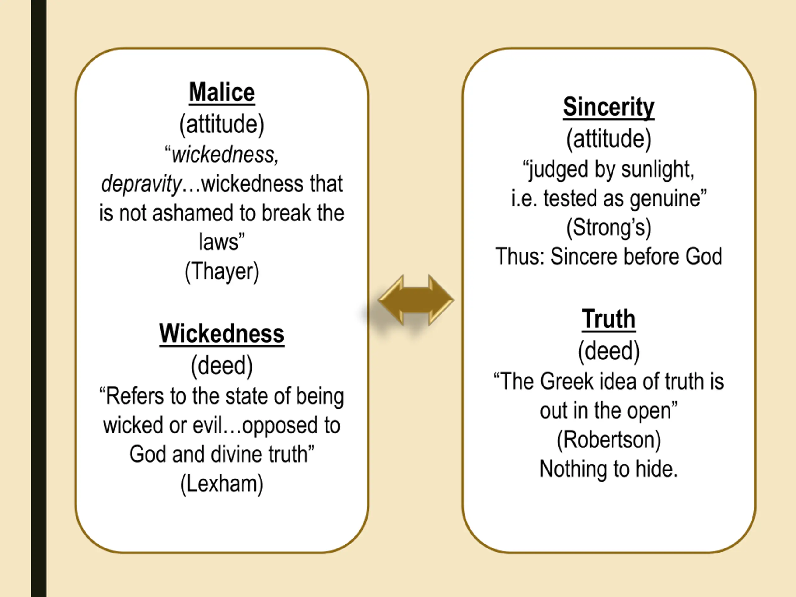 Malice (attitude) “wickedness, Sincerity (attitude) “judged by sunlight, i.e. tested as genuine” (Strong’s) Thus: Sincere before God depravity…wickedness that is not ashamed to break the laws” (Thayer) Truth (deed) Wickedness (deed) “Refers to the state of being wicked or evil…opposed to God and divine truth” (Lexham) “The Greek idea of truth is out in the open” (Robertson) Nothing to hide.
