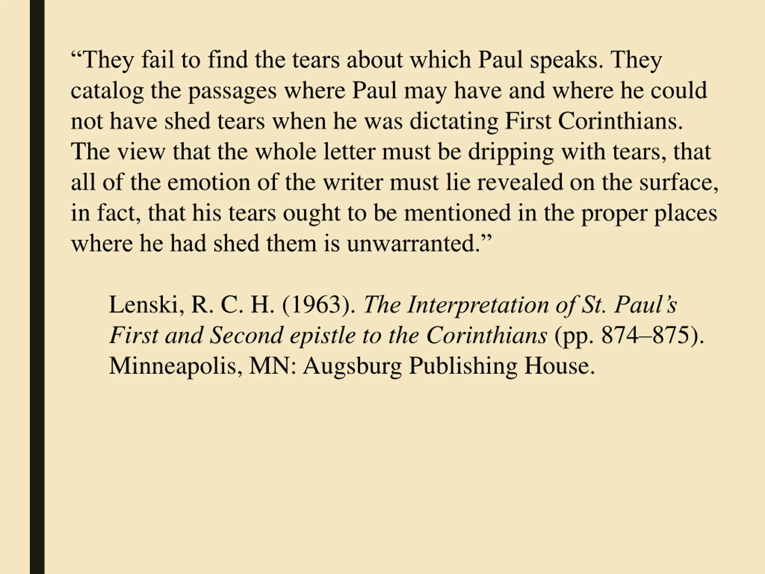 “They fail to find the tears about which Paul speaks. They catalog the passages where Paul may have and where he could not have shed tears when he was dictating First Corinthians. The view that the whole letter must be dripping with tears, that all of the emotion of the writer must lie revealed on the surface, in fact, that his tears ought to be mentioned in the proper places where he had shed them is unwarranted.” Lenski, R. C. H. (1963). The Interpretation of St. Paul’s First and Second epistle to the Corinthians (pp. 874–875). Minneapolis, MN: Augsburg Publishing House.