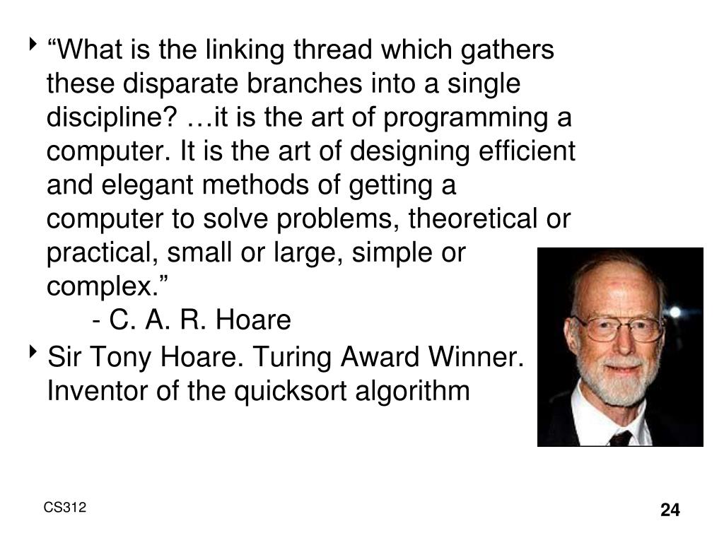 “What is the linking thread which gathers these disparate branches into a single discipline? …it is the art of programming a computer. It is the art of designing efficient and elegant methods of getting a computer to solve problems, theoretical or practical, small or large, simple or complex.” - C. A. R. Hoare • Sir Tony Hoare. Turing Award Winner. Inventor of the quicksort algorithm CS312