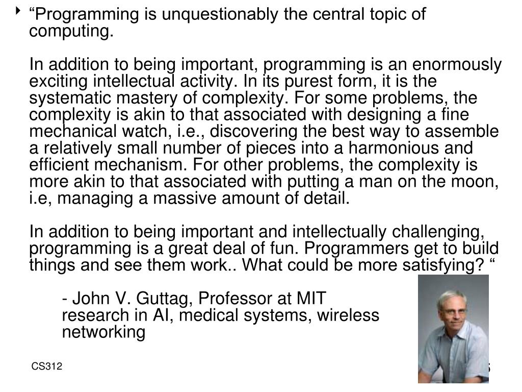 “Programming is unquestionably the central topic of computing. In addition to being important, programming is an enormously exciting intellectual activity. In its purest form, it is the systematic mastery of complexity. For some problems, the complexity is akin to that associated with designing a fine mechanical watch, i.e., discovering the best way to assemble a relatively small number of pieces into a harmonious and efficient mechanism. For other problems, the complexity is more akin to that associated with putting a man on the moon, i.e, managing a massive amount of detail. In addition to being important and intellectually challenging, programming is a great deal of fun. Programmers get to build things and see them work.. What could be more satisfying? “ - John V. Guttag, Professor at MIT research in AI, medical systems, wireless networking CS312
