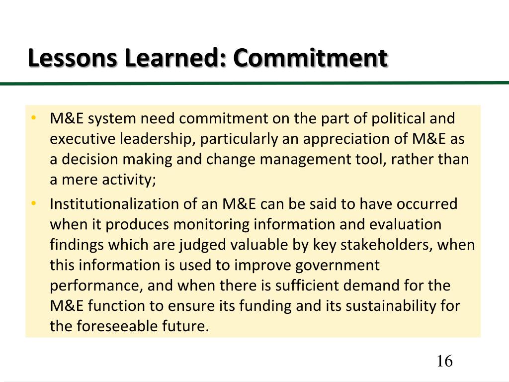 Lessons Learned: Commitment • M&E system need commitment on the part of political and executive leadership, particularly an appreciation of M&E as a decision making and change management tool, rather than a mere activity; • Institutionalization of an M&E can be said to have occurred when it produces monitoring information and evaluation findings which are judged valuable by key stakeholders, when this information is used to improve government performance, and when there is sufficient demand for the M&E function to ensure its funding and its sustainability for the foreseeable future. 16
