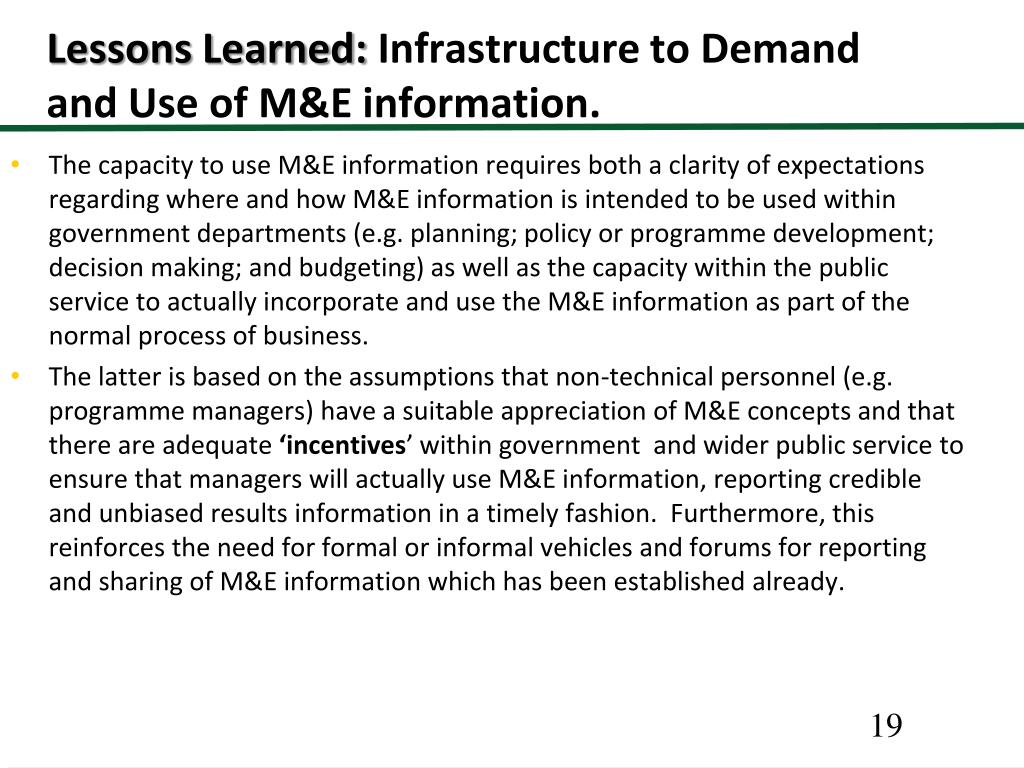 Lessons Learned: Technical Capacity and Infrastructure to supply M&E information • Technical capacity includes both the existence of credible and relevant data and information-gathering systems as well as the skilled personnel to gather, analyze and report on the performance of Departmental policies and programmes. Additionally, infrastructure is needed to help ensure a systematic, comprehensive and credible approach to M&E. • This would include policies and standards that would clarify roles, responsibilities and accountabilities for performance monitoring and evaluation; establish expectations across the system regarding frequency of reporting; and, set out quality standards for M&E conduct. 18