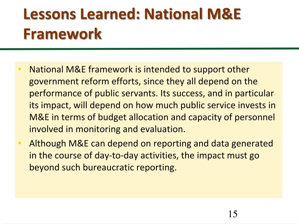 Lessons Learned: National M&E Framework • National M&E framework is intended to support other government reform efforts, since they all depend on the performance of public servants. Its success, and in particular its impact, will depend on how much public service invests in M&E in terms of budget allocation and capacity of personnel involved in monitoring and evaluation. • Although M&E can depend on reporting and data generated in the course of day-to-day activities, the impact must go beyond such bureaucratic reporting. 15