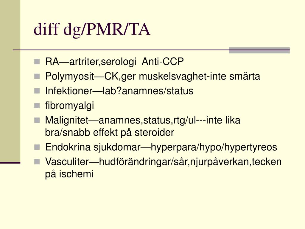 diff dg/PMR/TA • RA—artriter,serologi Anti-CCP • Polymyosit—CK,ger muskelsvaghet-inte smärta • Infektioner—lab?anamnes/status • fibromyalgi • Malignitet—anamnes,status,rtg/ul---inte lika bra/snabb effekt på steroider • Endokrina sjukdomar—hyperpara/hypo/hypertyreos • Vasculiter—hudförändringar/sår,njurpåverkan,tecken på ischemi