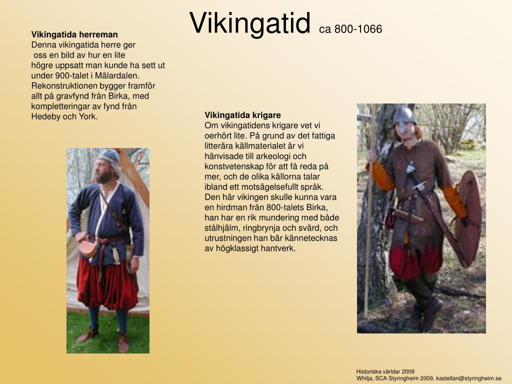 Vikingatid ca 800-1066. Vikingatida herreman Denna vikingatida herre ger oss en bild av hur en lite högre uppsatt man kunde ha sett ut under 900-talet i Mälardalen. Rekonstruktionen bygger framför allt på gravfynd från Birka, med kompletteringar av fynd från Hedeby och York.