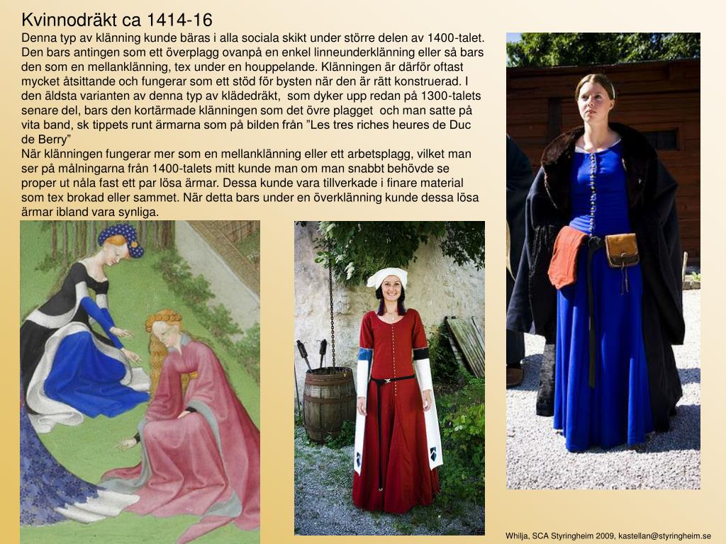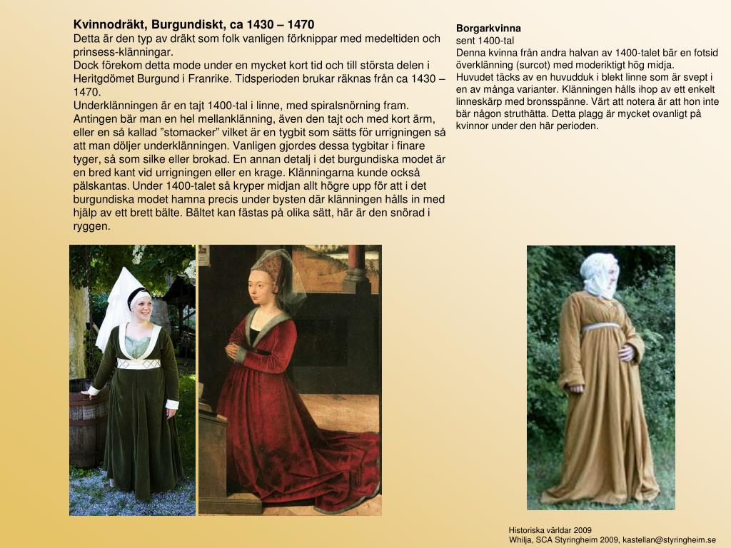 Kvinnodräkt, Burgundiskt, ca 1430 – 1470 Detta är den typ av dräkt som folk vanligen förknippar med medeltiden och prinsess-klänningar. Dock förekom detta mode under en mycket kort tid och till största delen i Heritgdömet Burgund i Franrike. Tidsperioden brukar räknas från ca 1430 – 1470. Underklänningen är en tajt 1400-tal i linne, med spiralsnörning fram. Antingen bär man en hel mellanklänning, även den tajt och med kort ärm, eller en så kallad ”stomacker” vilket är en tygbit som sätts för urrigningen så att man döljer underklänningen. Vanligen gjordes dessa tygbitar i finare tyger, så som silke eller brokad. En annan detalj i det burgundiska modet är en bred kant vid urrigningen eller en krage. Klänningarna kunde också pälskantas.Under 1400-talet så kryper midjan allt högre upp för att i det burgundiska modet hamna precis under bysten där klänningen hålls in med hjälp av ett brett bälte. Bältet kan fästas på olika sätt, här är den snörad i ryggen. Borgarkvinna sent 1400-tal Denna kvinna från andra halvan av 1400-talet bär en fotsid överklänning (surcot) med moderiktigt hög midja. Huvudet täcks av en huvudduk i blekt linne som är svept i en av många varianter. Klänningen hålls ihop av ett enkelt linneskärp med bronsspänne. Värt att notera är att hon inte bär någon struthätta. Detta plagg är mycket ovanligt på kvinnor under den här perioden. Historiska världar 2009 Whilja, SCA Styringheim 2009, kastellan@styringheim.se