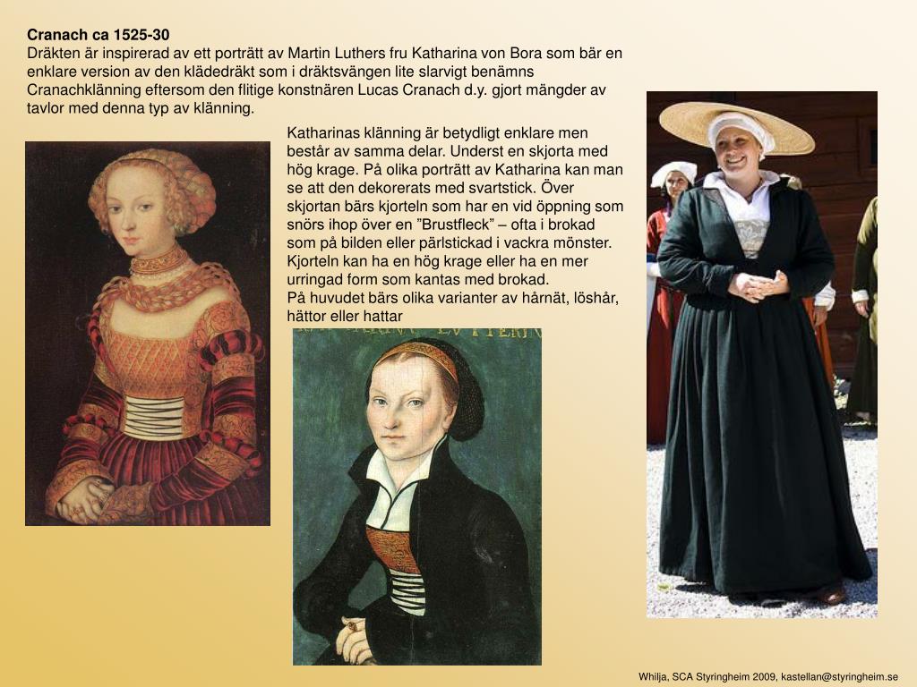 Cranach ca 1525-30 Dräkten är inspirerad av ett porträtt av Martin Luthers fru Katharina von Bora som bär en enklare version av den klädedräkt som i dräktsvängen lite slarvigt benämns Cranachklänning eftersom den flitige konstnären Lucas Cranach d.y. gjort mängder av tavlor med denna typ av klänning. Katharinas klänning är betydligt enklare men består av samma delar. Underst en skjorta med hög krage. På olika porträtt av Katharina kan man se att den dekorerats med svartstick. Över skjortan bärs kjorteln som har en vid öppning som snörs ihop över en ”Brustfleck” – ofta i brokad som på bilden eller pärlstickad i vackra mönster. Kjorteln kan ha en hög krage eller ha en mer urringad form som kantas med brokad. På huvudet bärs olika varianter av hårnät, löshår, hättor eller hattar Whilja, SCA Styringheim 2009, kastellan@styringheim.se