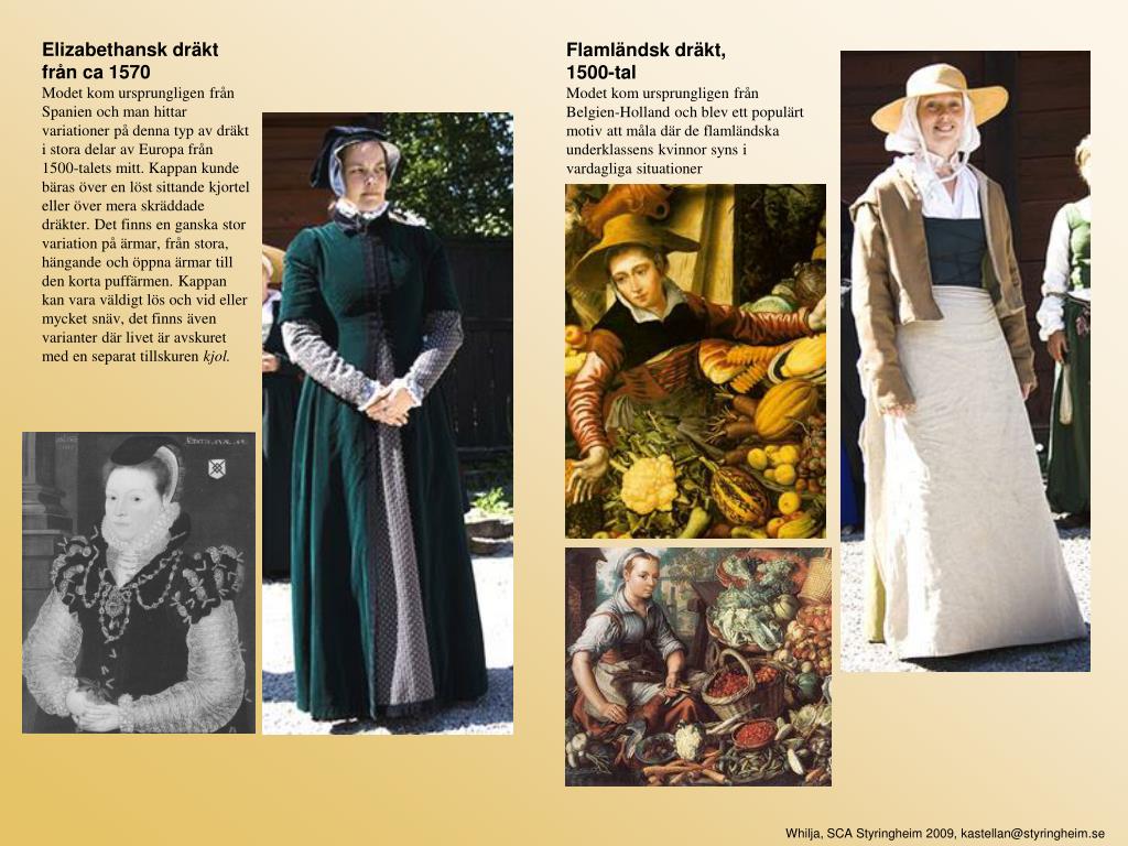 Elizabethansk dräkt från ca 1570 Modet kom ursprungligen från Spanien och man hittar variationer på denna typ av dräkt i stora delar av Europa från 1500-talets mitt. Kappan kunde bäras över en löst sittande kjortel eller över mera skräddade dräkter. Det finns en ganska stor variation på ärmar, från stora, hängande och öppna ärmar till den korta puffärmen. Kappan kan vara väldigt lös och vid eller mycket snäv, det finns även varianter där livet är avskuret med en separat tillskuren kjol. Flamländsk dräkt, 1500-tal Modet kom ursprungligen från Belgien-Holland och blev ett populärt motiv att måla där de flamländska underklassens kvinnor syns i vardagliga situationer Whilja, SCA Styringheim 2009, kastellan@styringheim.se