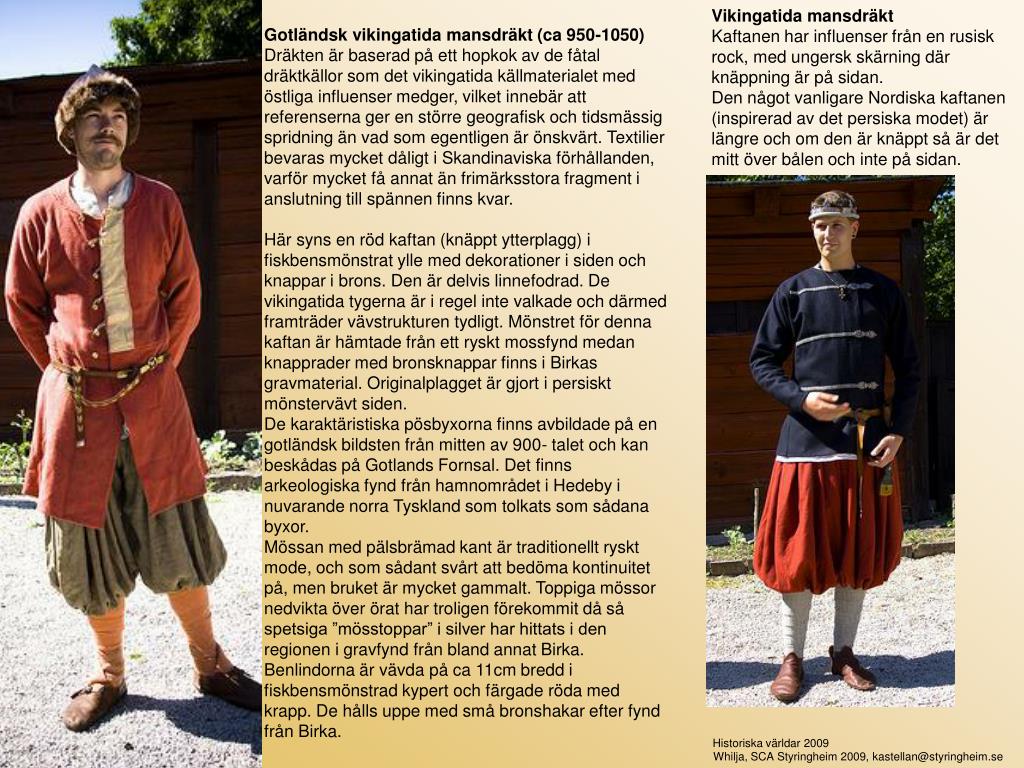 Vikingatida mansdräkt Kaftanen har influenser från en rusisk rock, med ungersk skärning där knäppning är på sidan. Den något vanligare Nordiska kaftanen (inspirerad av det persiska modet) är längre och om den är knäppt så är det mitt över bålen och inte på sidan. Gotländsk vikingatida mansdräkt (ca 950-1050) Dräkten är baserad på ett hopkok av de fåtal dräktkällor som det vikingatida källmaterialet med östliga influenser medger, vilket innebär att referenserna ger en större geografisk och tidsmässig spridning än vad som egentligen är önskvärt. Textilier bevaras mycket dåligt i Skandinaviska förhållanden, varför mycket få annat än frimärksstora fragment i anslutning till spännen finns kvar. Här syns en röd kaftan (knäppt ytterplagg) i fiskbensmönstrat ylle med dekorationer i siden och knappar i brons. Den är delvis linnefodrad. De vikingatida tygerna är i regel inte valkade och därmed framträder vävstrukturen tydligt. Mönstret för denna kaftan är hämtade från ett ryskt mossfynd medan knapprader med bronsknappar finns i Birkas gravmaterial. Originalplagget är gjort i persiskt mönstervävt siden. De karaktäristiska pösbyxorna finns avbildade på en gotländsk bildsten från mitten av 900- talet och kan beskådas på Gotlands Fornsal. Det finns arkeologiska fynd från hamnområdet i Hedeby i nuvarande norra Tyskland som tolkats som sådana byxor. Mössan med pälsbrämad kant är traditionellt ryskt mode, och som sådant svårt att bedöma kontinuitet på, men bruket är mycket gammalt. Toppiga mössor nedvikta över örat har troligen förekommit då så spetsiga ”mösstoppar” i silver har hittats i den regionen i gravfynd från bland annat Birka. Benlindorna är vävda på ca 11cm bredd i fiskbensmönstrad kypert och färgade röda med krapp. De hålls uppe med små bronshakar efter fynd från Birka. Historiska världar 2009 Whilja, SCA Styringheim 2009, kastellan@styringheim.se