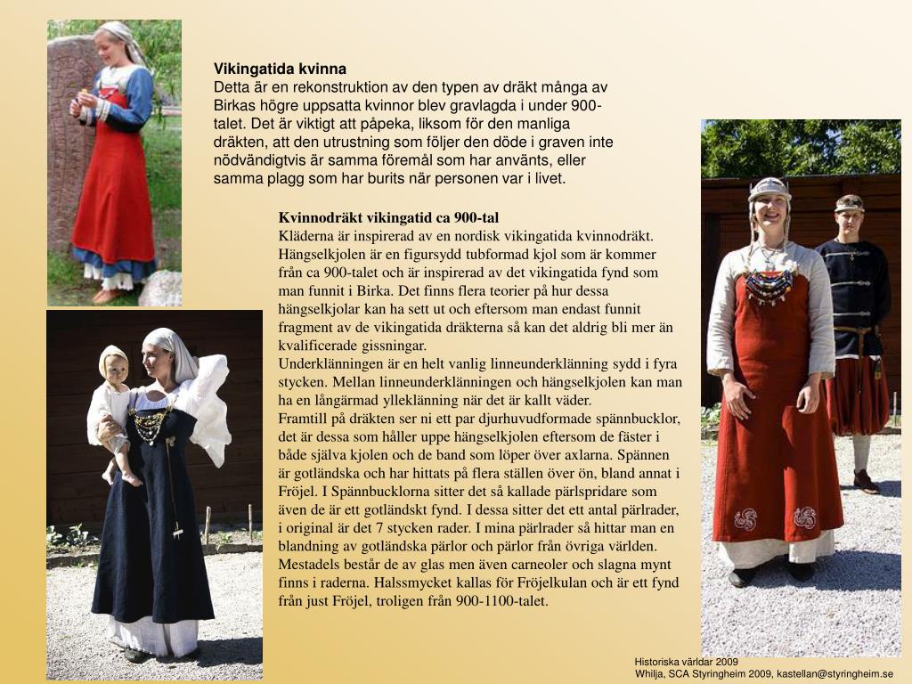 Vikingatida kvinna Detta är en rekonstruktion av den typen av dräkt många av Birkas högre uppsatta kvinnor blev gravlagda i under 900-talet. Det är viktigt att påpeka, liksom för den manliga dräkten, att den utrustning som följer den döde i graven inte nödvändigtvis är samma föremål som har använts, eller samma plagg som har burits när personen var i livet. Kvinnodräkt vikingatid ca 900-tal Kläderna är inspirerad av en nordisk vikingatida kvinnodräkt. Hängselkjolen är en figursydd tubformad kjol som är kommer från ca 900-talet och är inspirerad av det vikingatida fynd som man funnit i Birka. Det finns flera teorier på hur dessa hängselkjolar kan ha sett ut och eftersom man endast funnit fragment av de vikingatida dräkterna så kan det aldrig bli mer än kvalificerade gissningar. Underklänningen är en helt vanlig linneunderklänning sydd i fyra stycken. Mellan linneunderklänningen och hängselkjolen kan man ha en långärmad ylleklänning när det är kallt väder. Framtill på dräkten ser ni ett par djurhuvudformade spännbucklor, det är dessa som håller uppe hängselkjolen eftersom de fäster i både själva kjolen och de band som löper över axlarna. Spännen är gotländska och har hittats på flera ställen över ön, bland annat i Fröjel. I Spännbucklorna sitter det så kallade pärlspridare som även de är ett gotländskt fynd. I dessa sitter det ett antal pärlrader, i original är det 7 stycken rader. I mina pärlrader så hittar man en blandning av gotländska pärlor och pärlor från övriga världen. Mestadels består de av glas men även carneoler och slagna mynt finns i raderna. Halssmycket kallas för Fröjelkulan och är ett fynd från just Fröjel, troligen från 900-1100-talet. Historiska världar 2009 Whilja, SCA Styringheim 2009, kastellan@styringheim.se