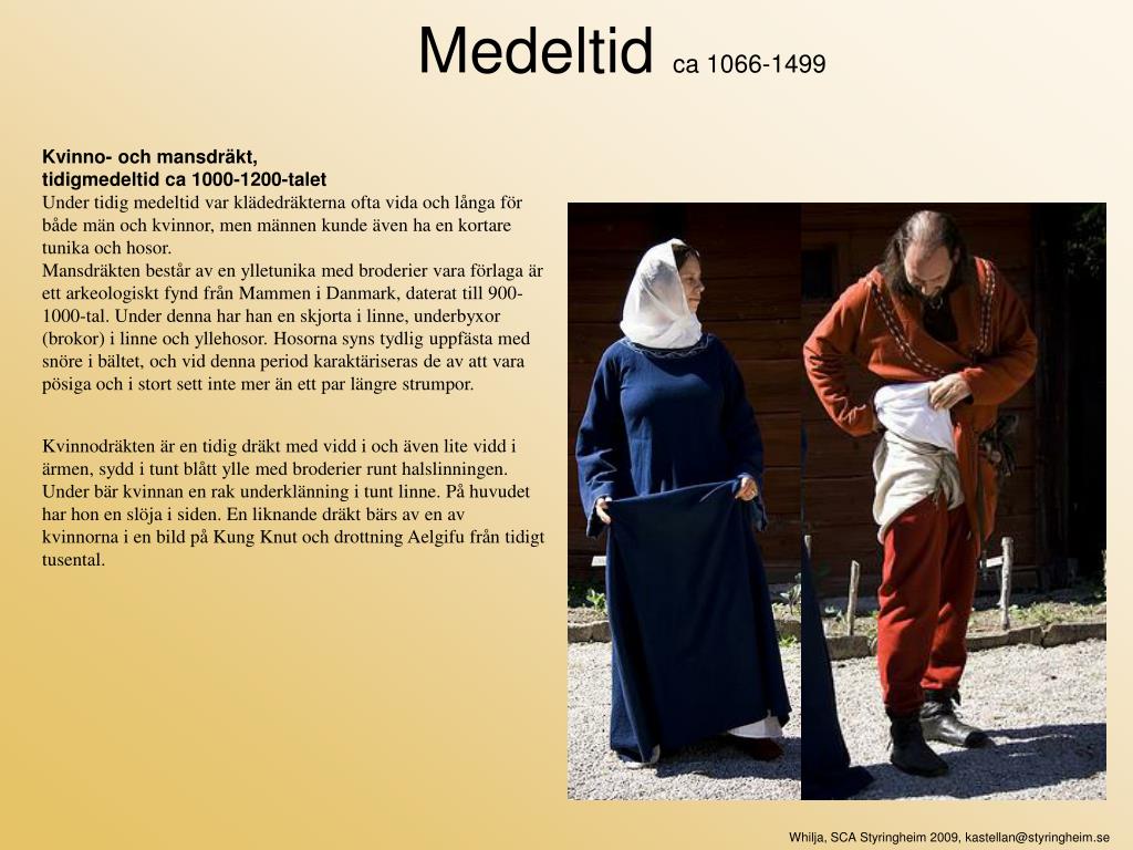 Medeltid ca 1066-1499 Kvinno- och mansdräkt, tidigmedeltid ca 1000-1200-talet Under tidig medeltid var klädedräkterna ofta vida och långa för både män och kvinnor, men männen kunde även ha en kortare tunika och hosor. Mansdräkten består av en ylletunika med broderier vara förlaga är ett arkeologiskt fynd från Mammen i Danmark, daterat till 900-1000-tal. Under denna har han en skjorta i linne, underbyxor (brokor) i linne och yllehosor. Hosorna syns tydlig uppfästa med snöre i bältet, och vid denna period karaktäriseras de av att vara pösiga och i stort sett inte mer än ett par längre strumpor. Kvinnodräkten är en tidig dräkt med vidd i och även lite vidd i ärmen, sydd i tunt blått ylle med broderier runt halslinningen. Under bär kvinnan en rak underklänning i tunt linne. På huvudet har hon en slöja i siden. En liknande dräkt bärs av en av kvinnorna i en bild på Kung Knut och drottning Aelgifu från tidigt tusental. Whilja, SCA Styringheim 2009, kastellan@styringheim.se