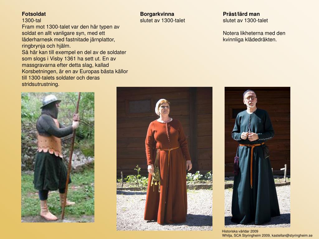 Fotsoldat 1300-tal Fram mot 1300-talet var den här typen av soldat en allt vanligare syn, med ett läderharnesk med fastnitade järnplattor, ringbrynja och hjälm.Så här kan till exempel en del av de soldater som slogs i Visby 1361 ha sett ut. En av massgravarna efter detta slag, kallad Korsbetningen, är en av Europas bästa källor till 1300-talets soldater och deras stridsutrustning. Borgarkvinna slutet av 1300-talet Präst/lärd man slutet av 1300-talet Notera likheterna med den kvinnliga klädedräkten. Historiska världar 2009 Whilja, SCA Styringheim 2009, kastellan@styringheim.se