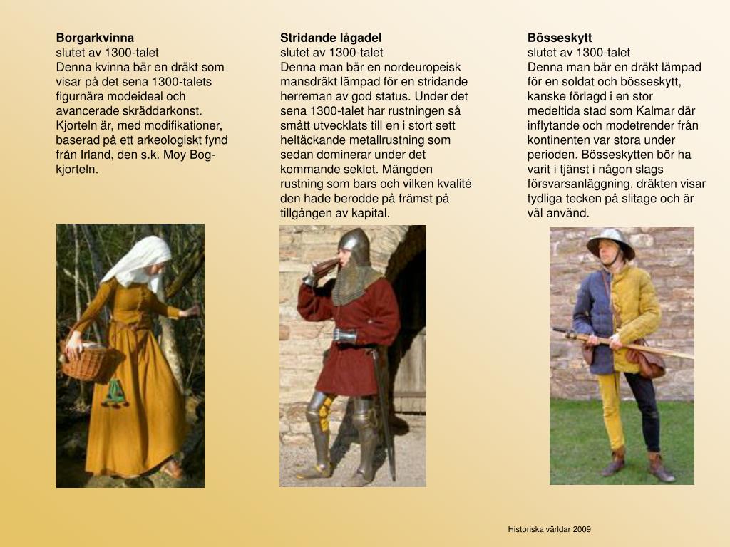 Borgarkvinna slutet av 1300-talet Denna kvinna bär en dräkt som visar på det sena 1300-talets figurnära modeideal och avancerade skräddarkonst.Kjorteln är, med modifikationer, baserad på ett arkeologiskt fynd från Irland, den s.k. Moy Bog-kjorteln. Stridande lågadel slutet av 1300-talet Denna man bär en nordeuropeisk mansdräkt lämpad för en stridande herreman av god status. Under det sena 1300-talet har rustningen så smått utvecklats till en i stort sett heltäckande metallrustning som sedan dominerar under det kommande seklet. Mängden rustning som bars och vilken kvalité den hade berodde på främst på tillgången av kapital. Bösseskytt slutet av 1300-talet Denna man bär en dräkt lämpad för en soldat och bösseskytt, kanske förlagd i en stor medeltida stad som Kalmar där inflytande och modetrender från kontinenten var stora under perioden. Bösseskytten bör ha varit i tjänst i någon slags försvarsanläggning, dräkten visar tydliga tecken på slitage och är väl använd. Historiska världar 2009
