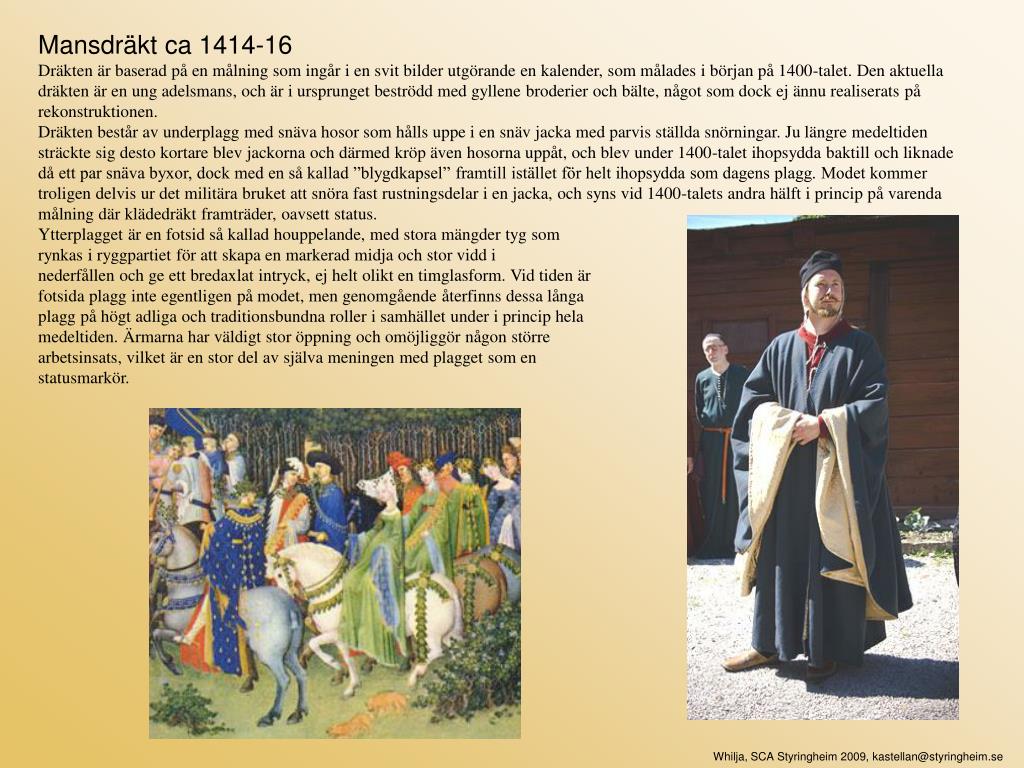 Mansdräkt ca 1414-16 Dräkten är baserad på en målning som ingår i en svit bilder utgörande en kalender, som målades i början på 1400-talet. Den aktuella dräkten är en ung adelsmans, och är i ursprunget beströdd med gyllene broderier och bälte, något som dock ej ännu realiserats på rekonstruktionen. Dräkten består av underplagg med snäva hosor som hålls uppe i en snäv jacka med parvis ställda snörningar. Ju längre medeltiden sträckte sig desto kortare blev jackorna och därmed kröp även hosorna uppåt, och blev under 1400-talet ihopsydda baktill och liknade då ett par snäva byxor, dock med en så kallad ”blygdkapsel” framtill istället för helt ihopsydda som dagens plagg. Modet kommer troligen delvis ur det militära bruket att snöra fast rustningsdelar i en jacka, och syns vid 1400-talets andra hälft i princip på varenda målning där klädedräkt framträder, oavsett status. Ytterplagget är en fotsid så kallad houppelande, med stora mängder tyg som rynkas i ryggpartiet för att skapa en markerad midja och stor vidd i nederfållen och ge ett bredaxlat intryck, ej helt olikt en timglasform. Vid tiden är fotsida plagg inte egentligen på modet, men genomgående återfinns dessa långa plagg på högt adliga och traditionsbundna roller i samhället under i princip hela medeltiden. Ärmarna har väldigt stor öppning och omöjliggör någon större arbetsinsats, vilket är en stor del av själva meningen med plagget som en statusmarkör. Whilja, SCA Styringheim 2009, kastellan@styringheim.se