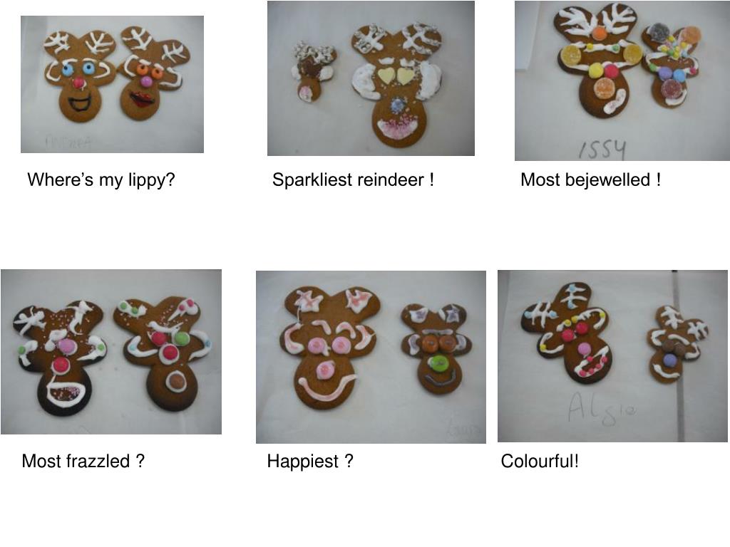 Three reindeer that meet the specification !. Y10 Reindeer. First. Second. Third. Where’s my lippy? Sparkliest reindeer ! Most bejewelled ! .
