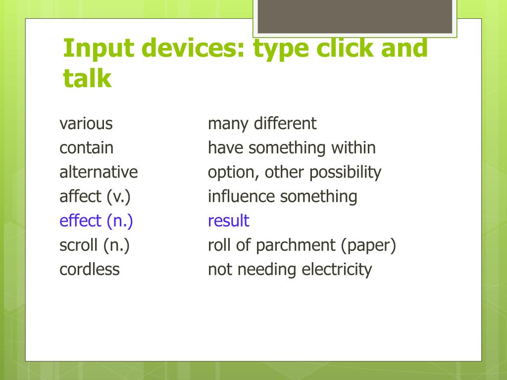 Input devices: type click and talk variousmany different contain have something within alternative option, other possibility affect (v.) influence something effect (n.) result scroll (n.) roll of parchment (paper) cordless not needing electricity