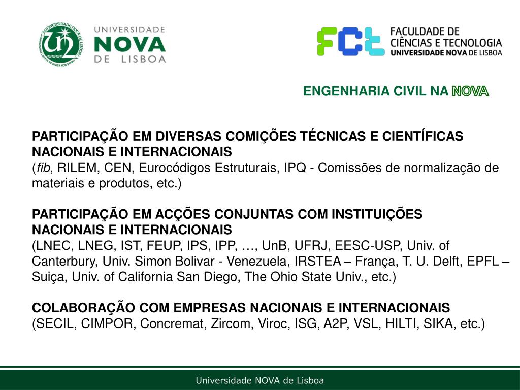 ENGENHARIA CIVIL NA NOVA • PARTICIPAÇÃO EM DIVERSAS COMIÇÕES TÉCNICAS E CIENTÍFICAS NACIONAIS E INTERNACIONAIS • (fib, RILEM, CEN, Eurocódigos Estruturais, IPQ - Comissões de normalização de materiais e produtos, etc.) • PARTICIPAÇÃO EM ACÇÕES CONJUNTAS COM INSTITUIÇÕES NACIONAIS E INTERNACIONAIS • (LNEC, LNEG, IST, FEUP, IPS, IPP, …, UnB, UFRJ, EESC-USP, Univ. of Canterbury, Univ. Simon Bolivar - Venezuela, IRSTEA – França, T. U. Delft, EPFL – Suiça, Univ. ofCalifornia San Diego, The Ohio StateUniv., etc.) • COLABORAÇÃO COM EMPRESAS NACIONAIS E INTERNACIONAIS(SECIL, CIMPOR, Concremat, Zircom, Viroc, ISG, A2P, VSL, HILTI, SIKA, etc.)