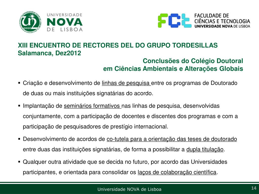 XIII ENCUENTRO DE RECTORES DEL DO GRUPO TORDESILLAS Salamanca, Dez2012 • Conclusões do Colégio Doutoral em Ciências Ambientais e Alterações Globais • Criação e desenvolvimento de linhas de pesquisa entre os programas de Doutorado de duas ou mais instituições signatárias do acordo. • Implantação de seminários formativos nas linhas de pesquisa, desenvolvidas conjuntamente, com a participação de docentes e discentes dos programas e com a participação de pesquisadores de prestígio internacional. • Desenvolvimento de acordos de co-tutela para a orientação das teses de doutorado entre duas das instituições signatárias, de forma a possibilitar a dupla titulação. • Qualquer outra atividade que se decida no futuro, por acordo das Universidades participantes, e orientada para consolidar os laços de colaboração científica.