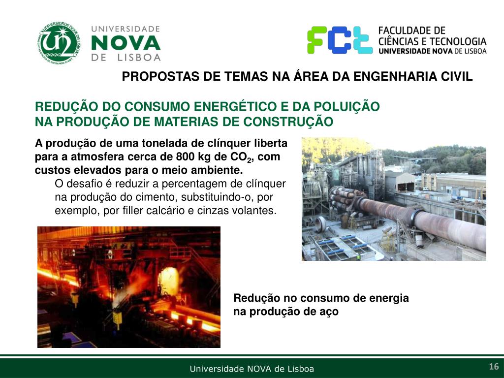 PROPOSTAS DE TEMAS NA ÁREA DA ENGENHARIA CIVIL REDUÇÃO DO CONSUMO ENERGÉTICO E DA POLUIÇÃO NA PRODUÇÃO DE MATERIAS DE CONSTRUÇÃO A produção de uma tonelada de clínquer liberta para a atmosfera cerca de 800 kg de CO2, com custos elevados para o meio ambiente. O desafio é reduzir a percentagem de clínquer na produção do cimento, substituindo-o, por exemplo, por filler calcário e cinzas volantes. Redução no consumo de energia na produção de aço