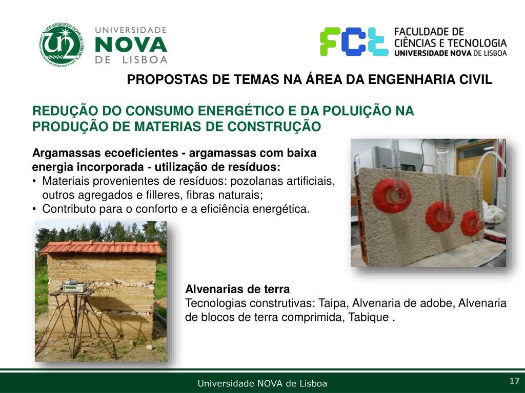 PROPOSTAS DE TEMAS NA ÁREA DA ENGENHARIA CIVIL REDUÇÃO DO CONSUMO ENERGÉTICO E DA POLUIÇÃO NA PRODUÇÃO DE MATERIAS DE CONSTRUÇÃO • Argamassas ecoeficientes - argamassas com baixa energia incorporada - utilização de resíduos: • Materiais provenientes de resíduos: pozolanas artificiais, outros agregados e filleres, fibras naturais; • Contributo para o conforto e a eficiência energética. Alvenarias de terraTecnologias construtivas: Taipa, Alvenaria de adobe, Alvenaria de blocos de terra comprimida, Tabique .