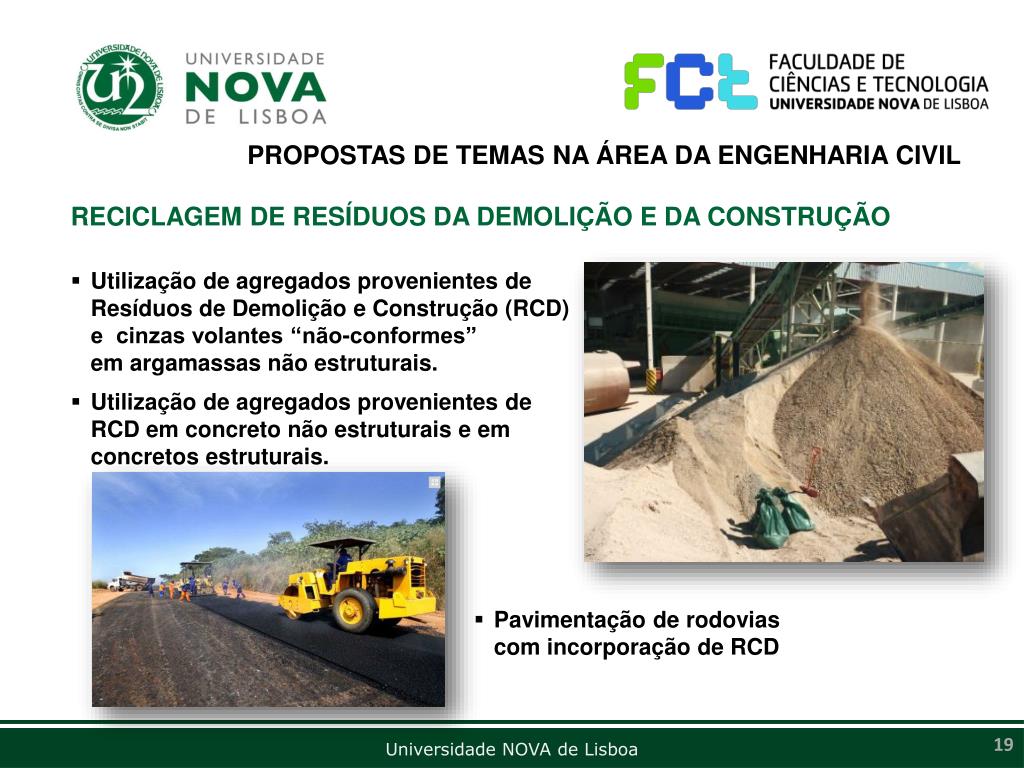 PROPOSTAS DE TEMAS NA ÁREA DA ENGENHARIA CIVIL RECICLAGEM DE RESÍDUOS DA DEMOLIÇÃO E DA CONSTRUÇÃO • Utilização de agregados provenientes de Resíduos de Demolição e Construção (RCD)e cinzas volantes “não-conformes” em argamassas não estruturais. • Utilização de agregados provenientes de RCD em concreto não estruturais e em concretos estruturais. • Pavimentação de rodovias com incorporação de RCD
