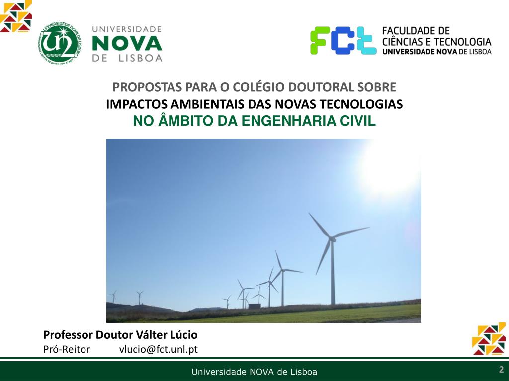PROPOSTAS PARA O COLÉGIO DOUTORAL SOBRE IMPACTOS AMBIENTAIS DAS NOVAS TECNOLOGIAS NO ÂMBITO DA ENGENHARIA CIVIL. Professor Doutor Válter Lúcio Pró-Reitor vlucio@fct.unl.pt. PROPOSTAS PARA O COLÉGIO DOUTORAL SOBRE IMPACTOS AMBIENTAIS DAS NOVAS TECNOLOGIAS NO ÂMBITO DA ENGENHARIA CIVIL.