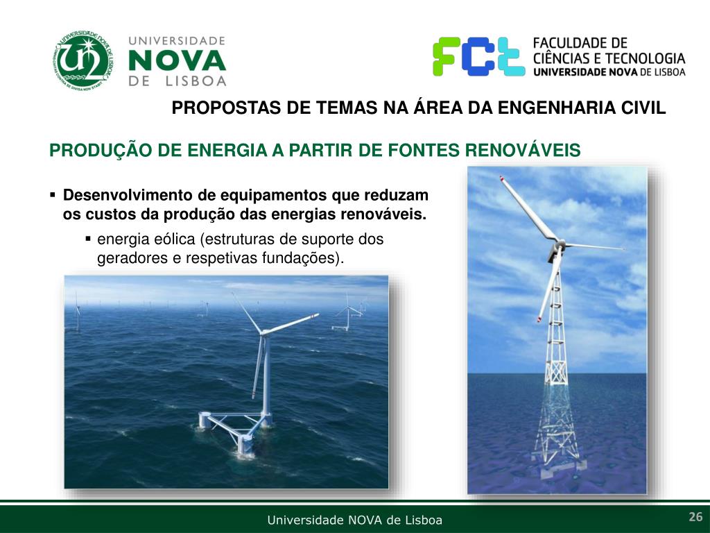 PROPOSTAS DE TEMAS NA ÁREA DA ENGENHARIA CIVIL PRODUÇÃO DE ENERGIA A PARTIR DE FONTES RENOVÁVEIS • Desenvolvimento de equipamentos que reduzam os custos da produção das energias renováveis. • energia eólica (estruturas de suporte dos geradores e respetivas fundações).