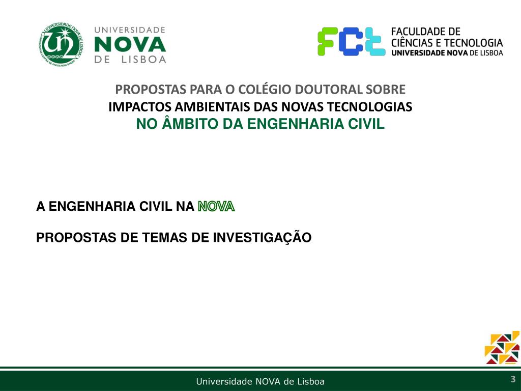 PROPOSTAS PARA O COLÉGIO DOUTORAL SOBRE IMPACTOS AMBIENTAIS DAS NOVAS TECNOLOGIAS NO ÂMBITO DA ENGENHARIA CIVIL • A ENGENHARIA CIVIL NA NOVA • PROPOSTAS DE TEMAS DE INVESTIGAÇÃO
