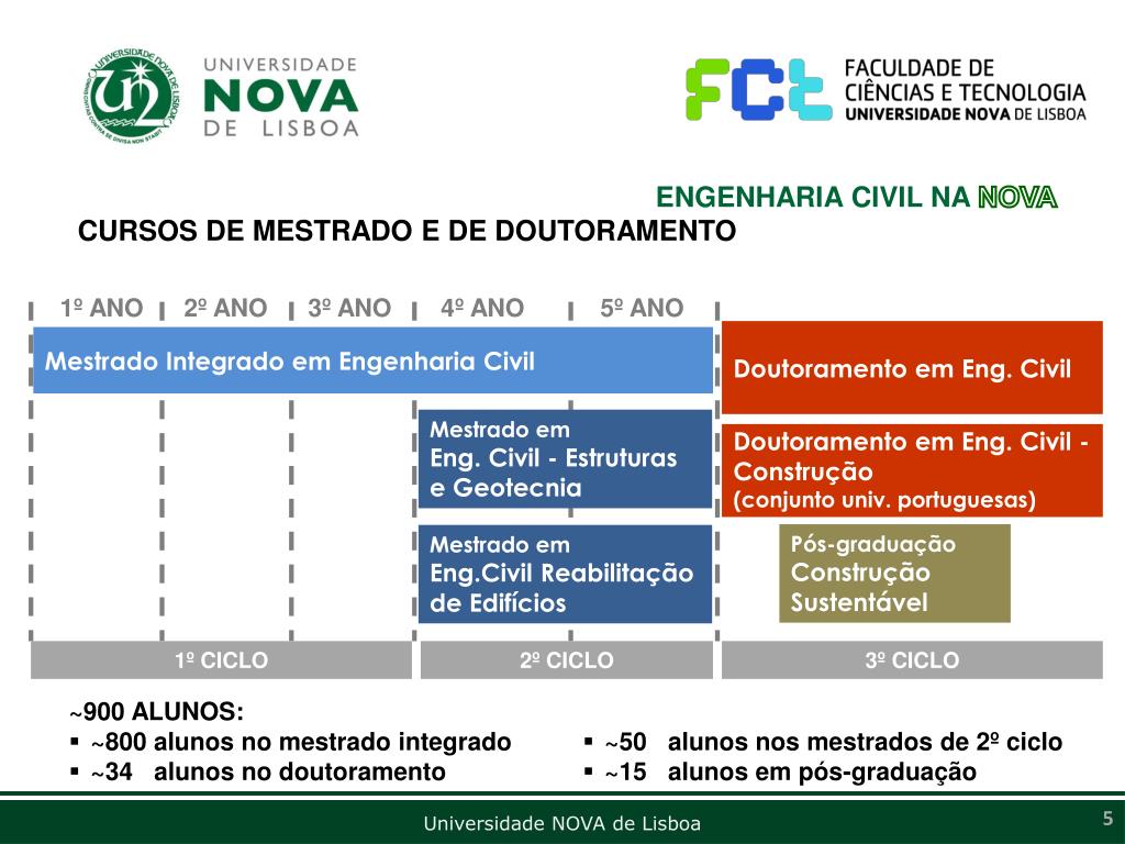 ENGENHARIA CIVIL NA NOVA • CURSOS DE MESTRADO E DE DOUTORAMENTO • 1º ANO • 2º ANO • 3º ANO • 4º ANO • 5º ANO Doutoramento em Eng. Civil Mestrado Integrado em Engenharia Civil Mestrado em Eng. Civil - Estruturas e Geotecnia Doutoramento em Eng. Civil - Construção (conjunto univ. portuguesas) Pós-graduaçãoConstrução Sustentável Mestrado em Eng.Civil Reabilitação de Edifícios • ~900 ALUNOS: • ~800 alunos no mestrado integrado • ~34 alunos no doutoramento • ~50 alunos nos mestrados de 2º ciclo • ~15 alunos em pós-graduação • 1º CICLO • 2º CICLO • 3º CICLO