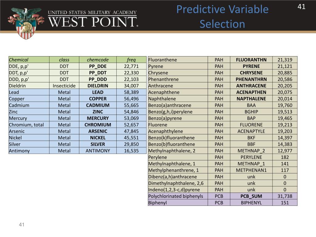 Limitations Impacts confidence and generalizablility • Chemical Analysis Exposure Misclassification • Different methods by study and over time from 1980-1999 • Handling of detection limits/ low concentrations • Bioassay • Species appropriate • Consistent methods and endpoint determination (EPA toxicity classification) • Data set • Spatial resolution: sample vs. station identification • Data input errors • Model: limited in number of parameters; trade-offs in selection of species and chemical predictors; care not to over-fit model Maintain large n with a complete representation of chemicals