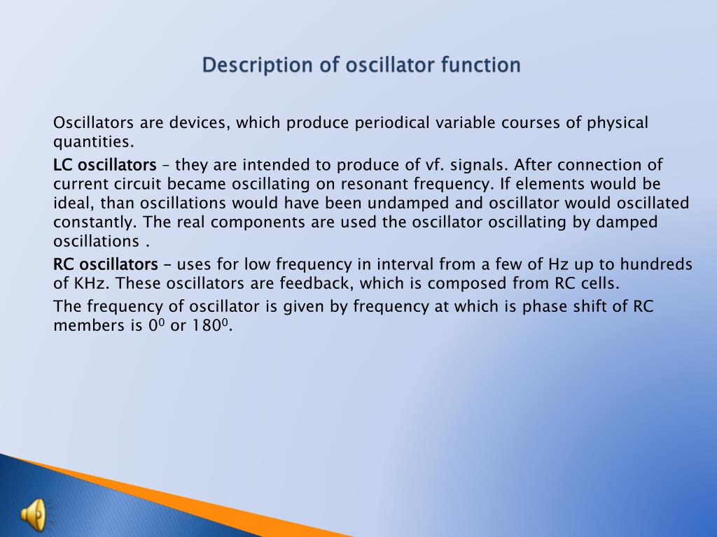 Description of oscillator function Oscillators are devices, which produce periodical variable courses of physical quantities. LC oscillators – they are intended to produce of vf. signals. After connection of current circuit became oscillating on resonant frequency. If elements would be ideal, than oscillations would have been undamped and oscillator would oscillated constantly. The real components are used the oscillator oscillating by damped oscillations . RC oscillators – uses for low frequency in interval from a few of Hz up to hundreds of KHz. These oscillators are feedback, which is composed from RC cells. The frequency of oscillator is given by frequency at which is phase shift of RC members is 00 or 1800.