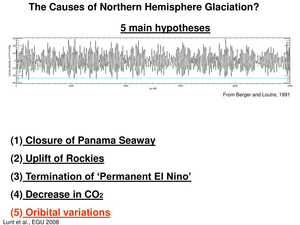 The Causes of Northern Hemisphere Glaciation? 5 main hypotheses From Berger and Loutre, 1991 • Closure of Panama Seaway • Uplift of Rockies • Termination of ‘Permanent El Nino’ • Decrease in CO2 • Oribital variations