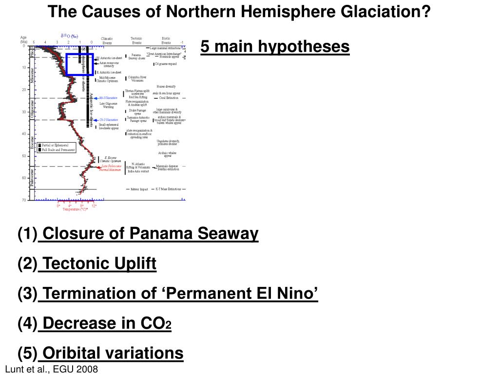 The Causes of Northern Hemisphere Glaciation? 5 main hypotheses • Closure of Panama Seaway • Tectonic Uplift • Termination of ‘Permanent El Nino’ • Decrease in CO2 • Oribital variations