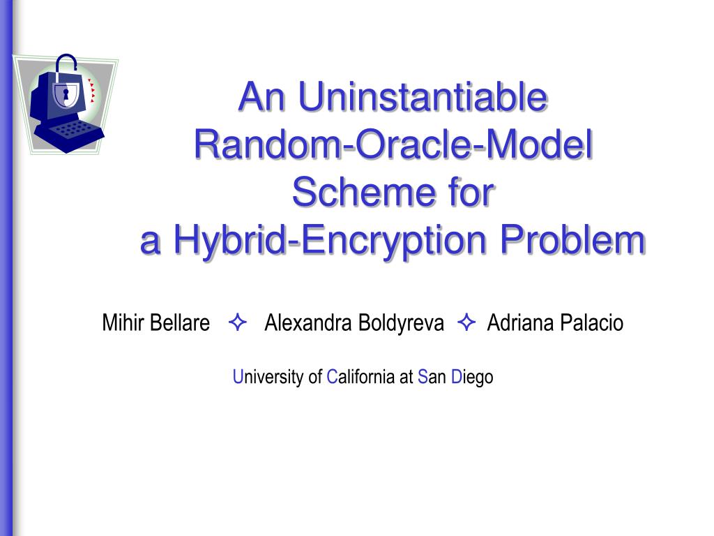 An Uninstantiable Random-Oracle-Model Scheme for a Hybrid-Encryption Problem Mihir Bellare Alexandra Boldyreva Adriana Palacio University of California at San Diego