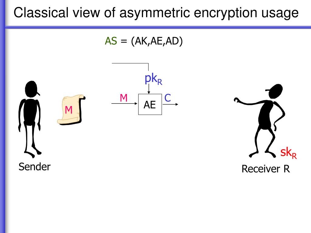 pkR C AE M Classical view of asymmetric encryption usage AS = (AK,AE,AD) M skR Sender Receiver R