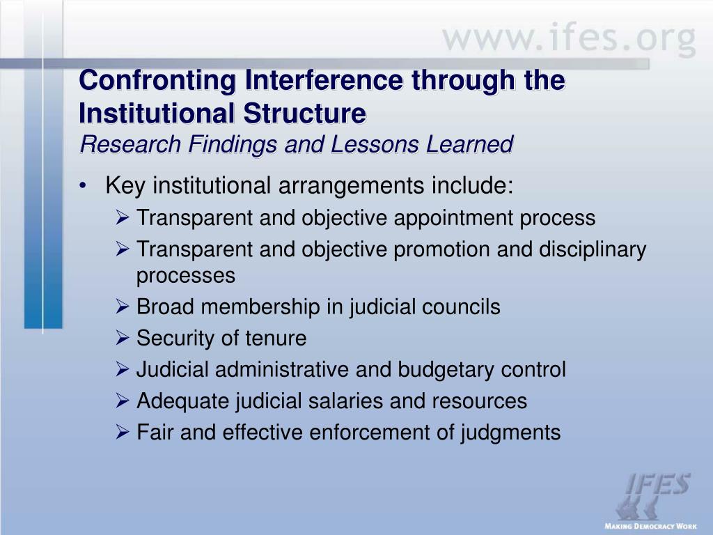 Confronting Interference through the Institutional StructureResearch Findings and Lessons Learned • Key institutional arrangements include: • Transparent and objective appointment process • Transparent and objective promotion and disciplinary processes • Broad membership in judicial councils • Security of tenure • Judicial administrative and budgetary control • Adequate judicial salaries and resources • Fair and effective enforcement of judgments