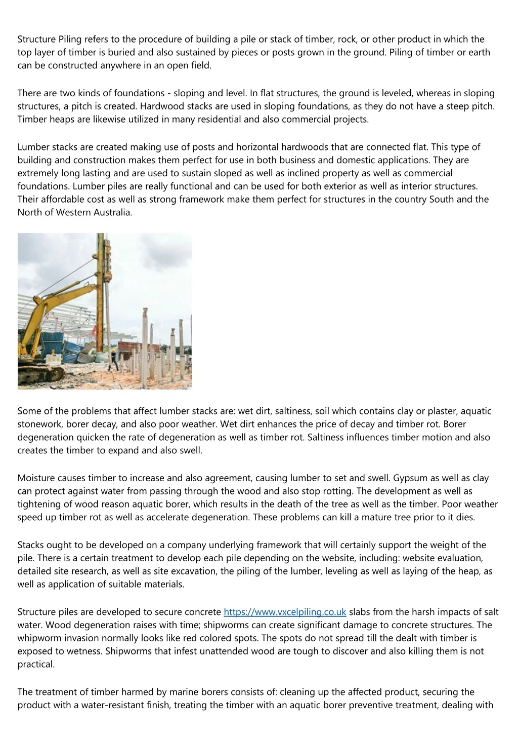 Structure Piling refers to the procedure of building a pile or stack of timber, rock, or other product in which the top layer of timber is buried and also sustained by pieces or posts grown in the ground. Piling of timber or earth can be constructed anywhere in an open field. There are two kinds of foundations - sloping and level. In flat structures, the ground is leveled, whereas in sloping structures, a pitch is created. Hardwood stacks are used in sloping foundations, as they do not have a steep pitch. Timber heaps are likewise utilized in many residential and also commercial projects. Lumber stacks are created making use of posts and horizontal hardwoods that are connected flat. This type of building and construction makes them perfect for use in both business and domestic applications. They are extremely long lasting and are used to sustain sloped as well as inclined property as well as commercial foundations. Lumber piles are really functional and can be used for both exterior as well as interior structures. Their affordable cost as well as strong framework make them perfect for structures in the country South and the North of Western Australia. Some of the problems that affect lumber stacks are: wet dirt, saltiness, soil which contains clay or plaster, aquatic stonework, borer decay, and also poor weather. Wet dirt enhances the price of decay and timber rot. Borer degeneration quicken the rate of degeneration as well as timber rot. Saltiness influences timber motion and also creates the timber to expand and also swell. Moisture causes timber to increase and also agreement, causing lumber to set and swell. Gypsum as well as clay can protect against water from passing through the wood and also stop rotting. The development as well as tightening of wood reason aquatic borer, which results in the death of the tree as well as the timber. Poor weather speed up timber rot as well as accelerate degeneration. These problems can kill a mature tree prior to it dies. Stacks ought to be developed on a company underlying framework that will certainly support the weight of the pile. There is a certain treatment to develop each pile depending on the website, including: website evaluation, detailed site research, as well as site excavation, the piling of the lumber, leveling as well as laying of the heap, as well as application of suitable materials. Structure piles are developed to secure concrete https://www.vxcelpiling.co.uk slabs from the harsh impacts of salt water. Wood degeneration raises with time; shipworms can create significant damage to concrete structures. The whipworm invasion normally looks like red colored spots. The spots do not spread till the dealt with timber is exposed to wetness. Shipworms that infest unattended wood are tough to discover and also killing them is not practical. The treatment of timber harmed by marine borers consists of: cleaning up the affected product, securing the product with a water-resistant finish, treating the timber with an aquatic borer preventive treatment, dealing with