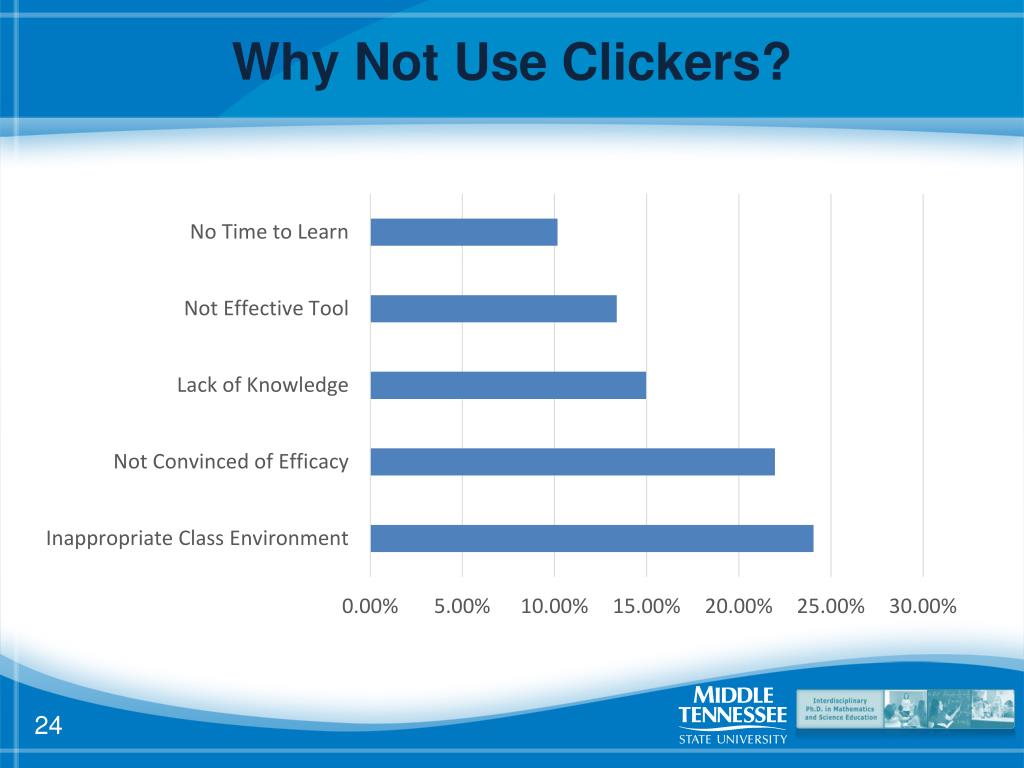 Research Questions • Why are undergraduate instructors not using or discontinuing use of clicker technology? • Convincing faculty of the efficacy and theoretical application of these technologies is difficult.