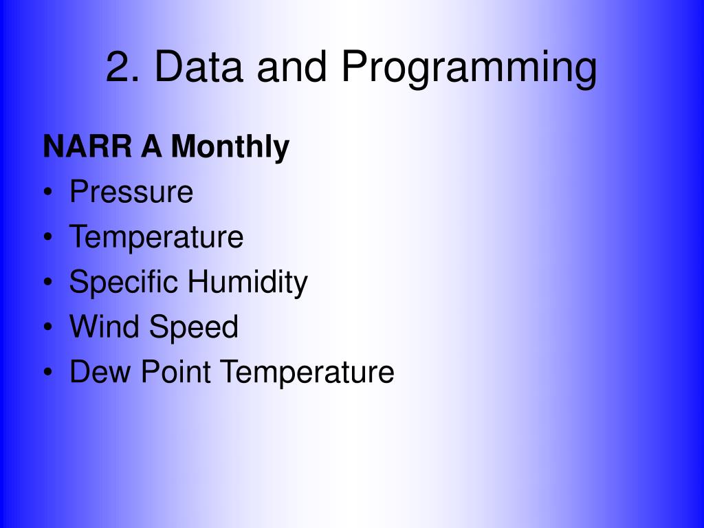 2. Data and Programming NARR A Monthly • Pressure • Temperature • Specific Humidity • Wind Speed • Dew Point Temperature