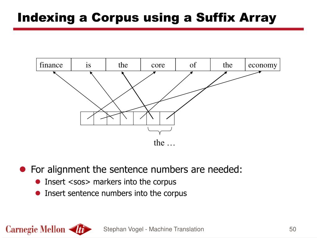 Indexing a Corpus using a Suffix Array • For alignment the sentence numbers are needed: • Insert <sos> markers into the corpus • Insert sentence numbers into the corpus finance is the core of the economy the … Stephan Vogel - Machine Translation