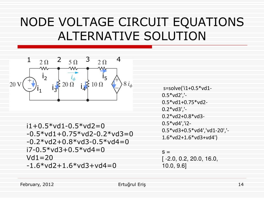 CIRCUIT EQUATIONS: MESH CURRENT ALTERNATIVE SOLUTION s=solve('1120*ia-1000*ic+va-5','120*ib-100*ic+5','-1000*ia-100*ib+1100*ic-va+10','101*ia-100*ib-ic'); >> s=[s.ia s.ib s.ic s.va] s = [ -1011/14164, -254/3541, -511/14164, 173035/3541] Ertuğrul Eriş