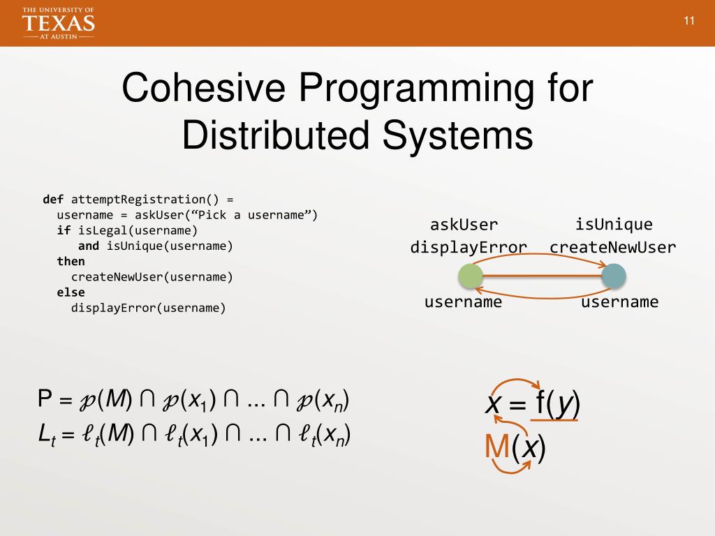Cohesive Programming for Distributed Systems defattemptRegistration() = username = askUser(“Pick a username”) ifisLegal(username) andisUnique(username) then createNewUser(username) else displayError(username) isUnique askUser displayError createNewUser username username P = 𝓅(M) ∩ 𝓅(x1) ∩ ... ∩ 𝓅(xn) Lt = 𝓁t(M) ∩ 𝓁t(x1) ∩ ... ∩ 𝓁t(xn) x = f(y) M(x)