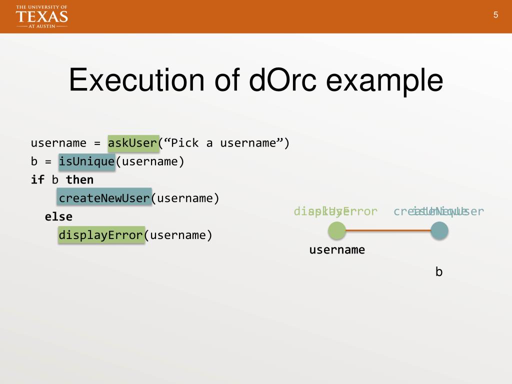 Execution of dOrc example username = askUser(“Pick a username”) b = isUnique(username) ifb then createNewUser(username) else displayError(username) isUnique displayError askUser createNewUser username username b